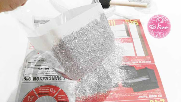 Cuando la purpurina está completamente seca, damos una capa de barniz por todo el espacio decorado y lo dejamos secar unas 8h.