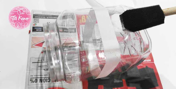 Como la tapa del bote es de un color azul muy feo, vamos a decorarla también, para ello vamos a dar una primera capa de pintura blanca, y cuando esta seca, le damos una segunda capa de color plata, que va perfectamente a juego con la purpurina que hemos puesto en nuestro bote de galletas.