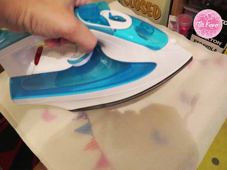 La dejamos secar y para fijar bien la pintura vamos a planchar la bolsa sin vapor de dos formas posibles: o le damos la vuelta a la tela o colocamos un poco de papel de horno encima de lo pintado y planchamos. Esta segunda forma es la que nos parece más cómoda y así lo hemos hecho.