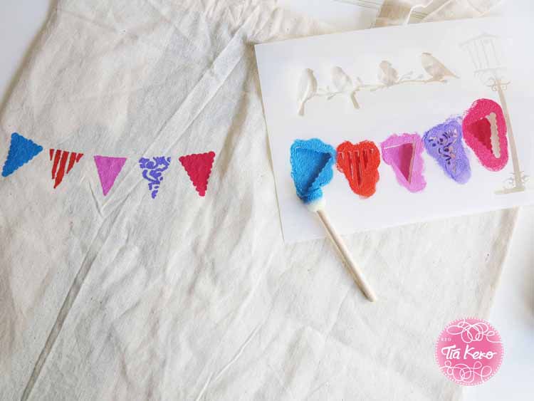 Cuando esa pintura está seca, nosotras utilizamos un pincel de pintura 3D para unir la guirnalda de banderas y darle un toque más chulo a la bolsa.