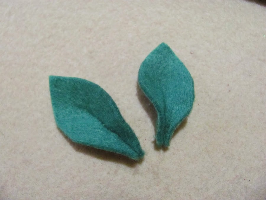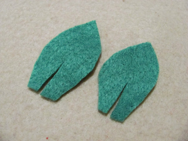 3.- Sin molde, cortar 2 hojitas en fieltro verde. Hacer un corte desde la base al centro de la hoja, tal como se ve en la imagen.