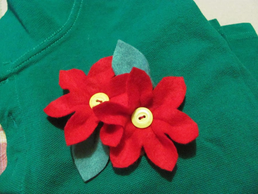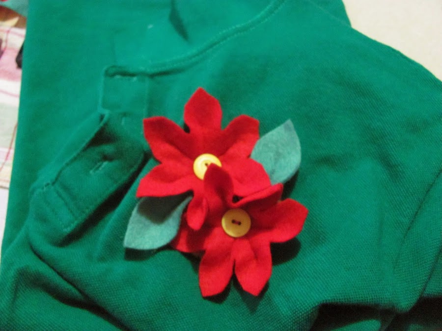 Finalmente decidi dejarlas así. Antes de coserlas a la camisa, las fijé con alfileres y posteriormente coloqué los botones. Les soy sincera, cuando las vi terminadas me parecieron mas noches buenas, que flores primaverales...jaja... pero estos colores de fieltro eran los únicos que tenia a mano y el tiempo lo tenia encima....jiji
