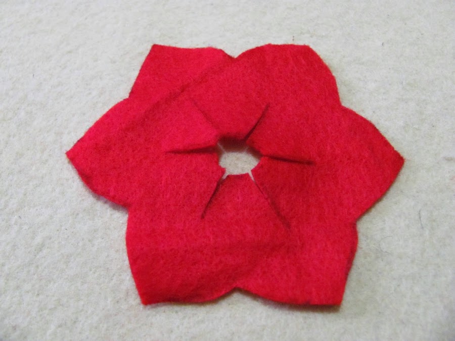 La flor ya cosida, se verá de esta forma. En este momento podemos recortar un poco mas los pétalos hacia el centro de la flor para que quede mas linda o si así los prefieren, se pueden quedar igual.