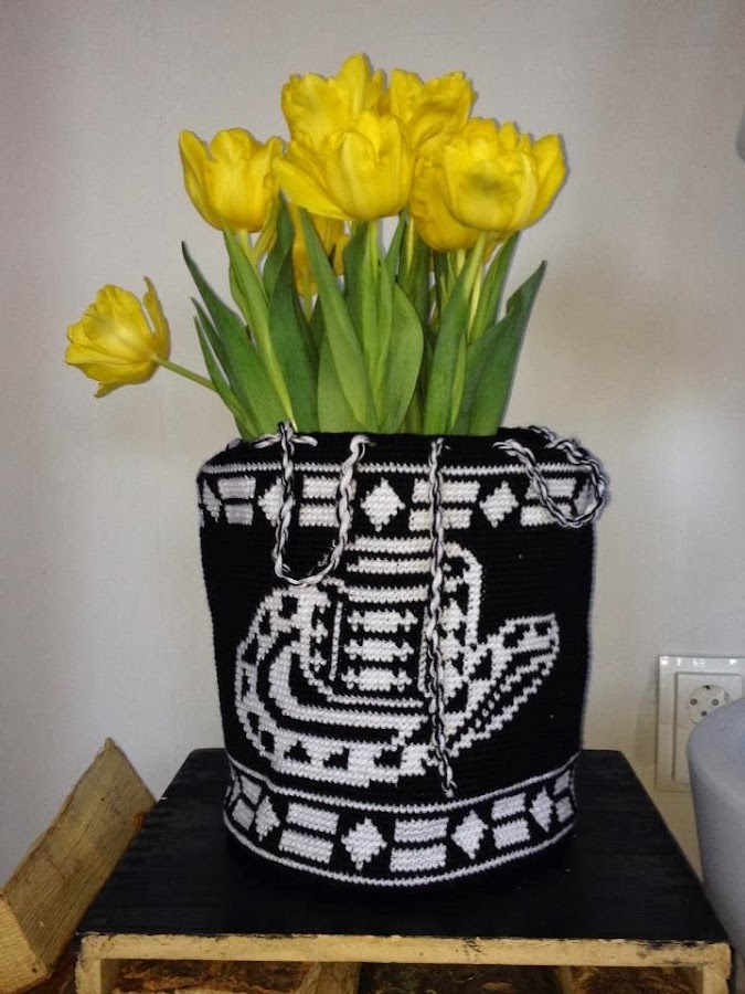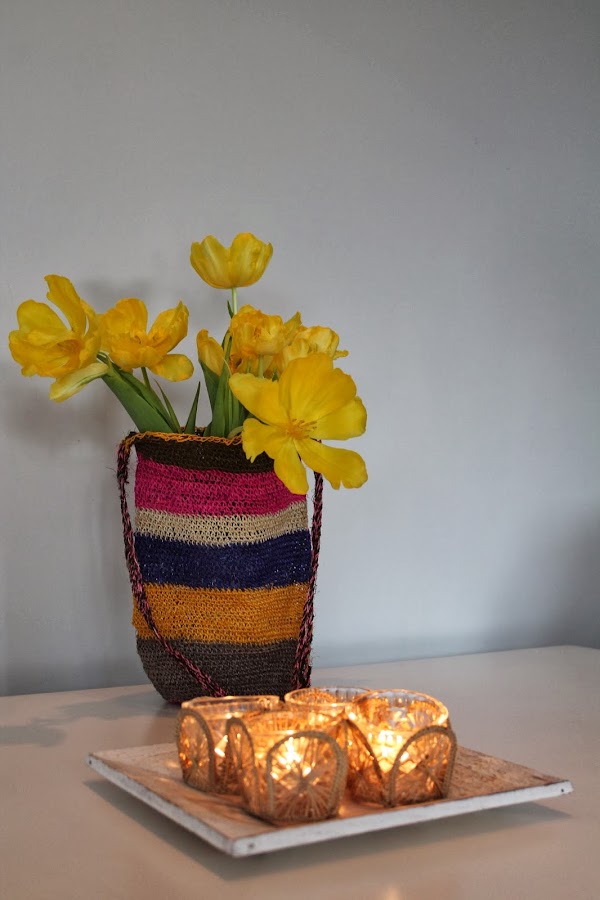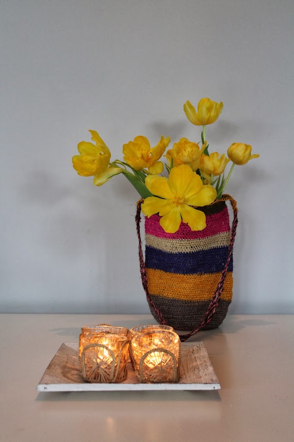 Este es un arreglo para mi mesa de comedor, es un saco con colgadera realizado con un material llamado Yute o Fique, hecho a mano por los indigenas de un pueblo llamado Sampúes, de allí que toma el nombre de Mochila Sampuesana, pues nada le coloque dentro un jarrón con algunos tulipanes y me diran ustedes que tal es...