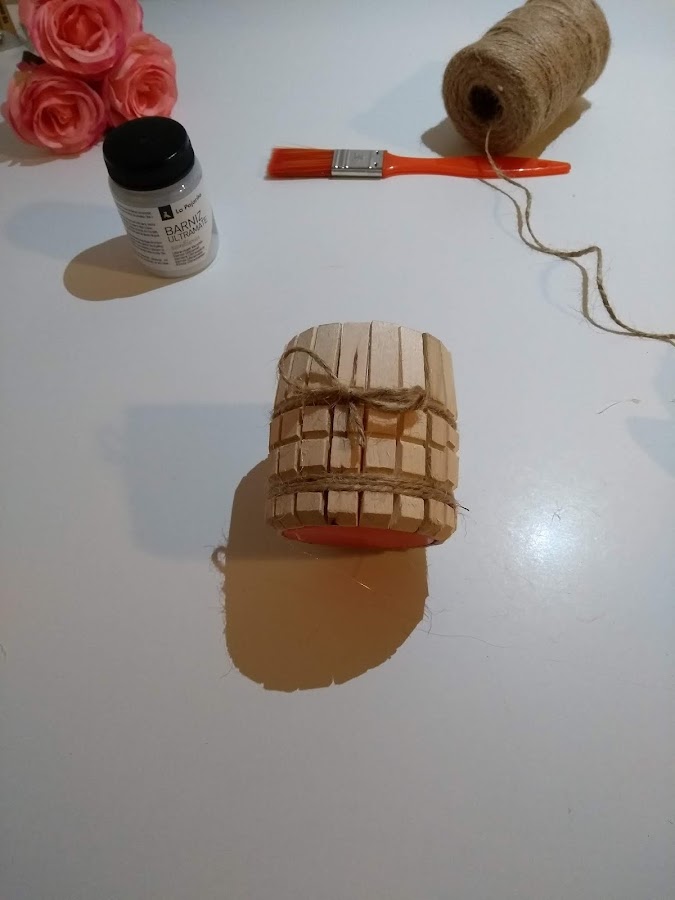 Una vez tengamos el recipiente envuelto por las pinzas, le añadiremos cuerda por al rededor de las muescas de la pinza, puedes usar cordel, cordel con un toque de color, puntilla, cinta, madroños pequeños... eso va al gusto de cada uno.