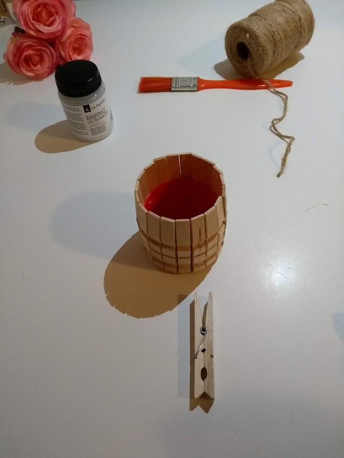 A continuación deberás poner unas gotas de pegamento en la parte plana de la pinza y pegarla al recipiente.