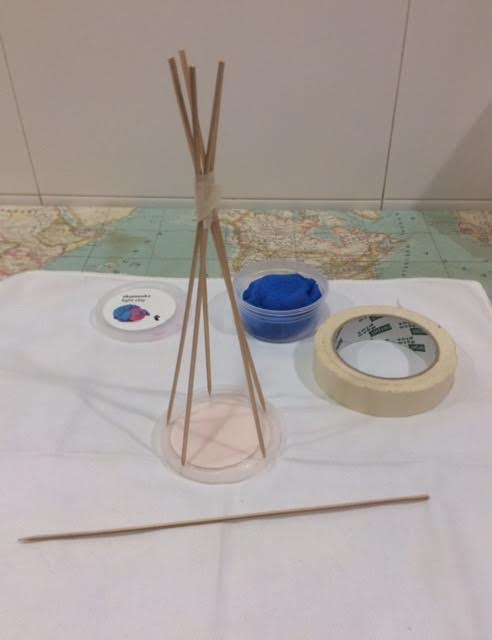 Con los palitos de brochetas y aprovechando la tapa del bote de plastilina he puesto la base para una tienda de campaña.