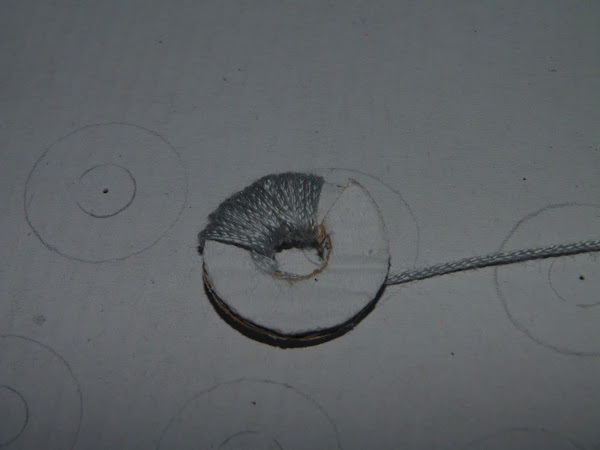 Después se les hace un corte desde la base hasta el agujero central, se unen haciendo coincidir los cortes, y a enrollar lana. Cuanto más mullliditos los queramos, más vueltas de lana daremos.
