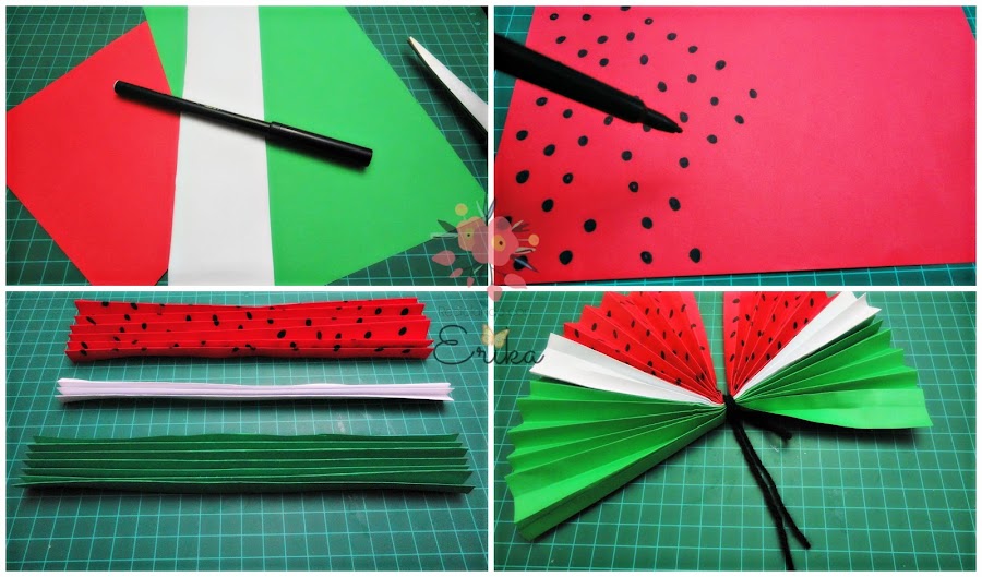 Para hacer el abanico , vamos a doblar en forma de acordeón cada hoja de papel , puedes medir un centímetro por cada doblez o hacerlo al cálculo . No te olvides pintar puntos negros a la hoja de color rojo , para simular las semillas de la sandía .