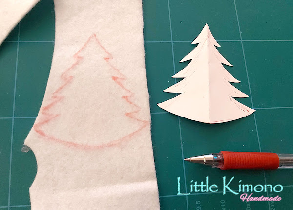 3. Con fieltro blanco cortamos la silueta que deseamos, el tema del reto era "Árboles de Navidad" propuesto por María y María Inés de Decosur Vintage, así que hice una plantilla a ojo^^ y la transferí al fieltro, pegamos con silicona caliente o pegamento para tela en el centro del bastidor y listo.