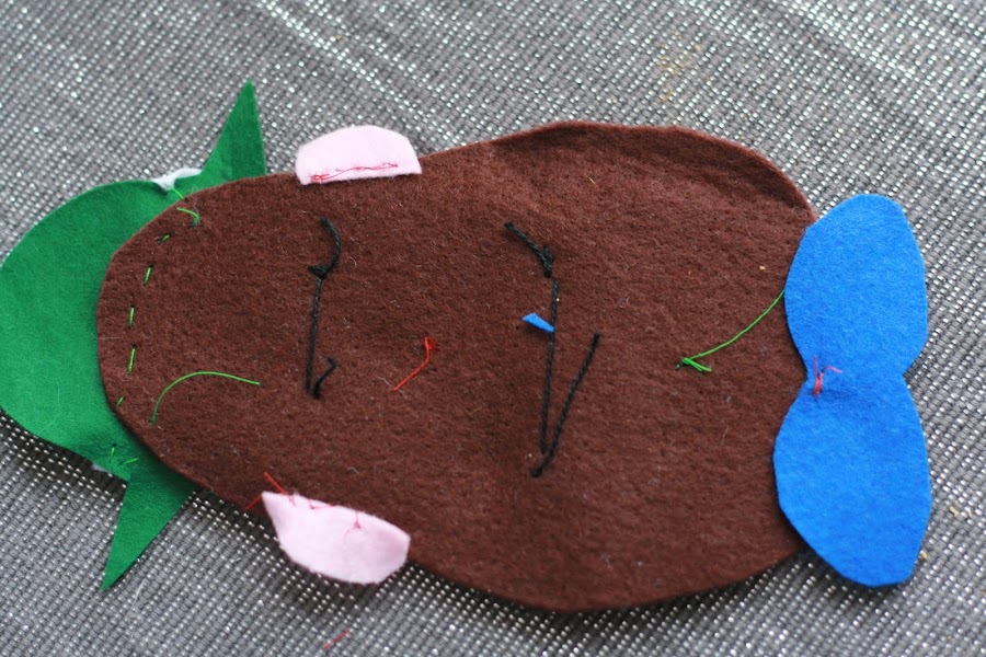 Presentamos las piezas para ver cómo quedan. Después unimos las piezas cosiendo y realizamos los detalles con hilos de colores.