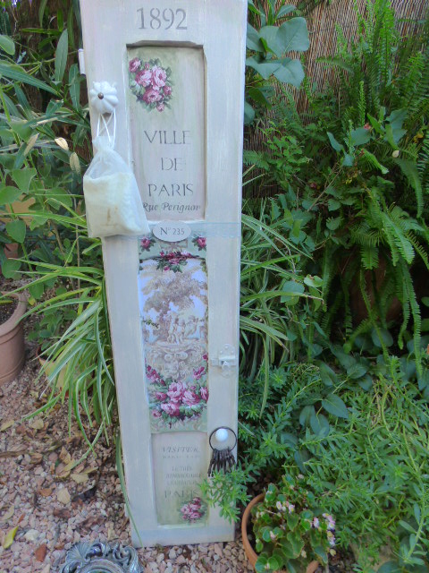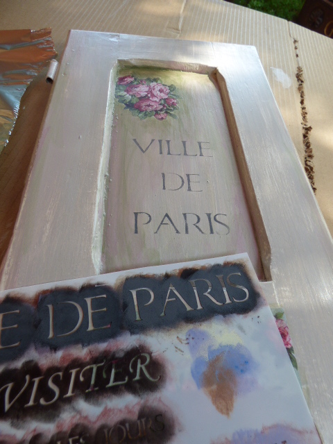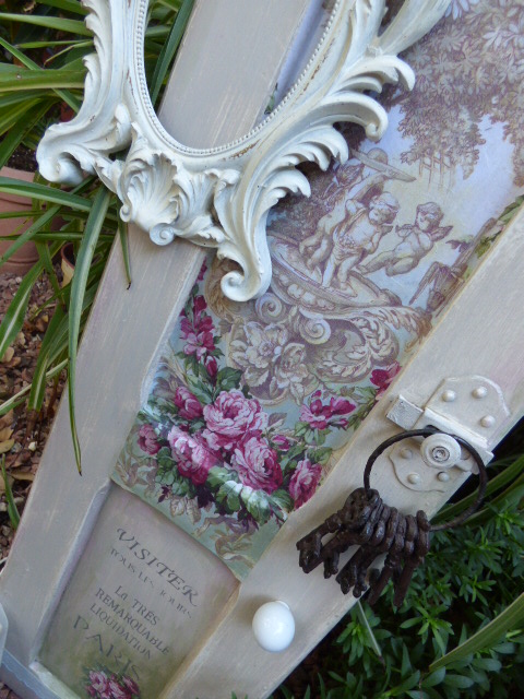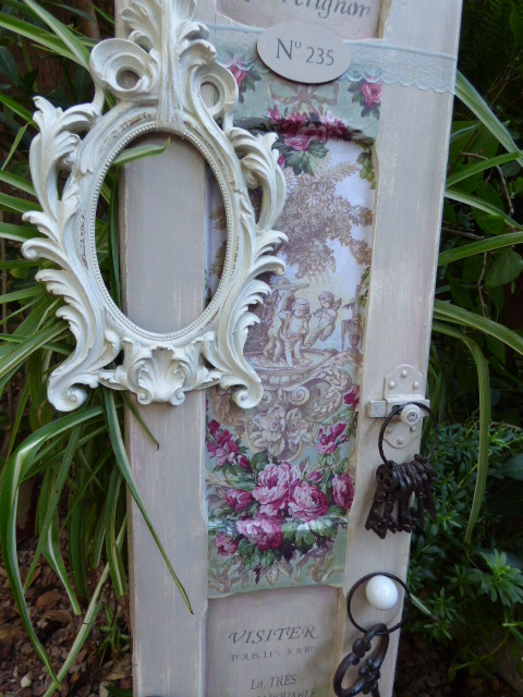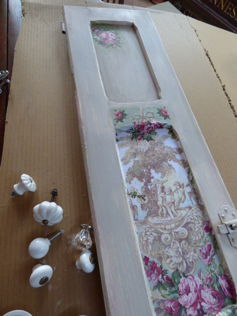 Esta es la contraventana que os enseñé el otro día que me acababa de encontrar. Media semana mirándola y convencida de que la iba a decorar en posición horizontal. Pero cuando el jueves me puse con ella me dí cuenta claramente de que tenía que hacerla en sentido vertical, para que no perdiera su esencia de contraventana....más que nada por el cerrojo que quería conservar....