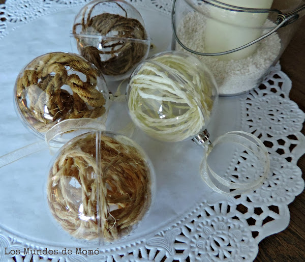 Y hoy empiezo por la última opción...el DIY!! Y os enseño estas bolas tan bonitas y originales.... bolas transparentes llenas de diferentes tipos de cuerdas. Algo sobrio y sencillo pero muy sorprendente y chic.