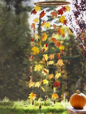 Con un aro de madera o plástico (podéis usar las asas de un bolso que venden en mercerías o tiendas de manualidades), cuerda, un montón de hojas y unas pequeñas piñas podemos preparar este móvil tan original, ideal para colgar en nuestro porche o balcón.