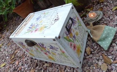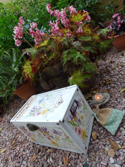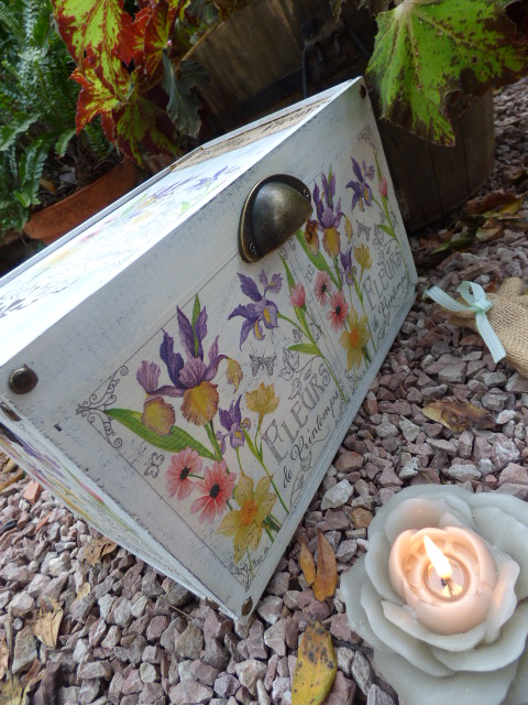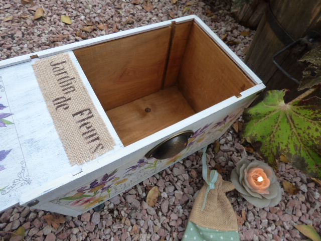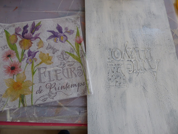 En esta foto se distinguen las letras que llevaba talladas la caja.....no me gusta nunca rellenar esas letras con pasta para disimularlas....es más....lo que me gusta es que se transparenten bajo el decapado y bajo las servilletas .....