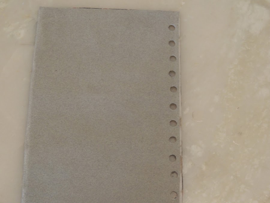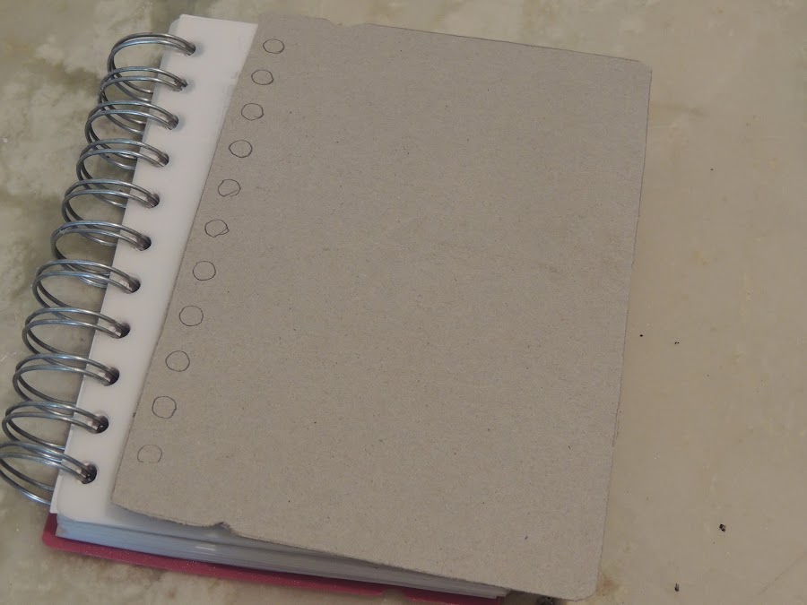 Medimos la agenda ya sin tapa, recortamos esas medidas en el cartón y marcamos donde vamos a perforar mas adelante.