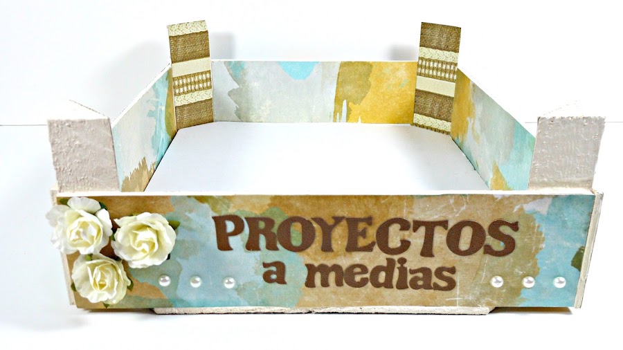 Yo utilicé chalk paint en color crema y luego utilicé papeles de scrapbooking que ya tenía en casa y unas flores de papel que compré en el bazar chino que tengo cerca de casa. Cómo voy a utilizar las cajas para guardar parte de mi material de trabajo, les he puesto nombres, usando letras troqueladas.