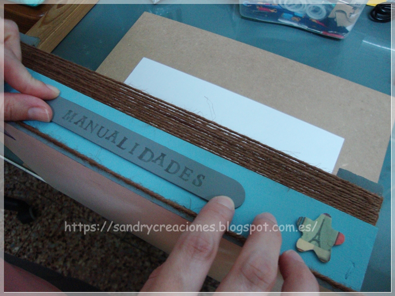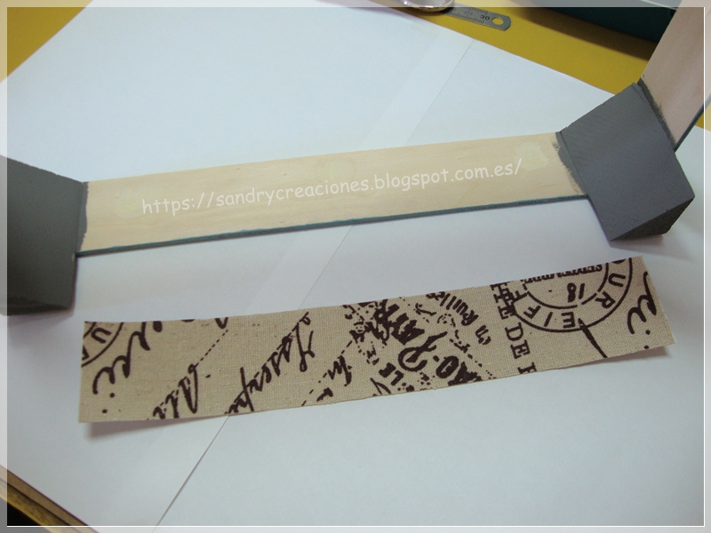 Pintamos los palos de helado anchos con pintura chalk paint de color vintage y una vez seca, con ayuda de tampones de letras y tinta negra marcamos los rótulos que queramos, en nuestro caso, uno con "SanDryCreaciones" y el otro con "Manualidades". Una vez seca la tinta barnizamos con barniz ultramate.