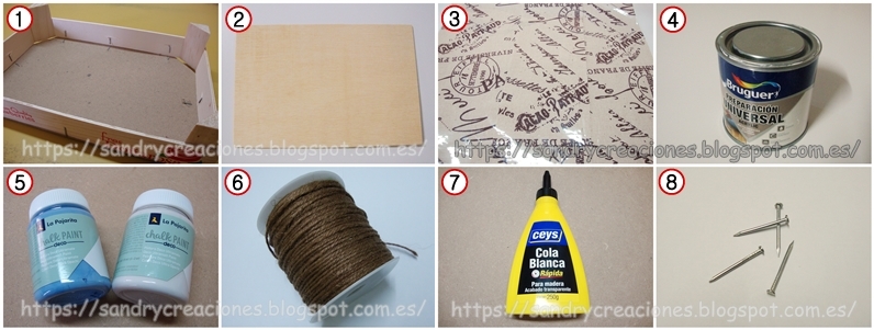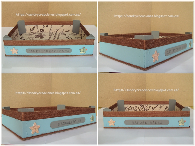 Paso 3. Pasar imprimación (opcional) y pintar la estructura de la caja por fuera y por dentro solo las esquinas. Pintamos la caja por fuera con una combinación de pinturas chalk paint, nosotros utilizamos los colores vintage y pacific island, luego por dentro forramos con tela autoadhesiva menos las esquinas que irán pintadas como la parte exterior. Utilizando pinturas chalk paint en principio no haría falta utilizar imprimación porque la pintura en si ya tapa mucho, pero como teníamos miedo que se nos vieran los dibujos de la caja de fresas, que no terminaron de borrarse, pasamos un poco de imprimación solo en la parte exterior dónde había dibujos, pero esto ya es a gusto de cada uno. Una vez puesta la imprimación y dejada secar pasamos a pintar con pintura chalk paint toda la parte exterior de la caja y la parte interior de las esquinas. Protegemos la pintura dándole una capa de barniz ultramate. En las siguientes imágenes podéis ver el paso de poner imprimación y en las fotos de más adelante y en las de la caja finalizada podréis ver como quedó la caja pintada, ya que en el momento en que la pintábamos se nos olvidó hacer la foto