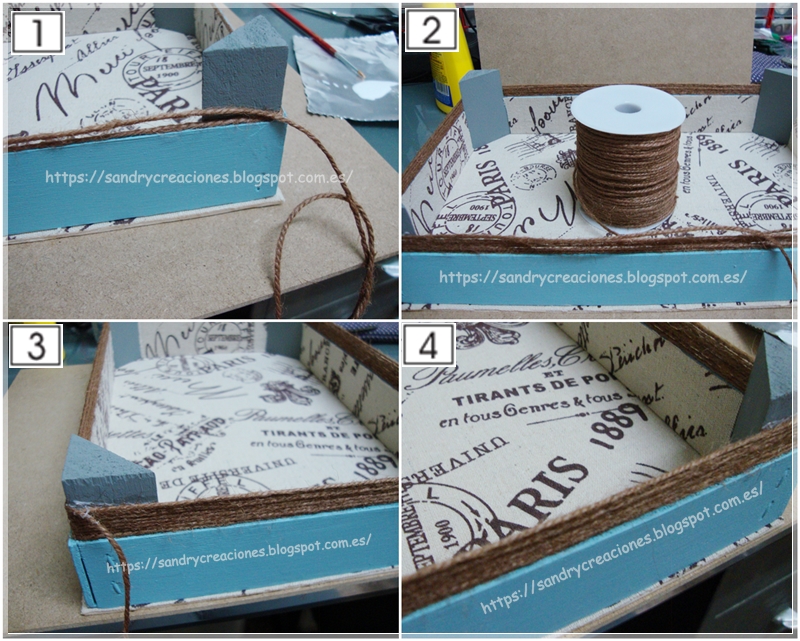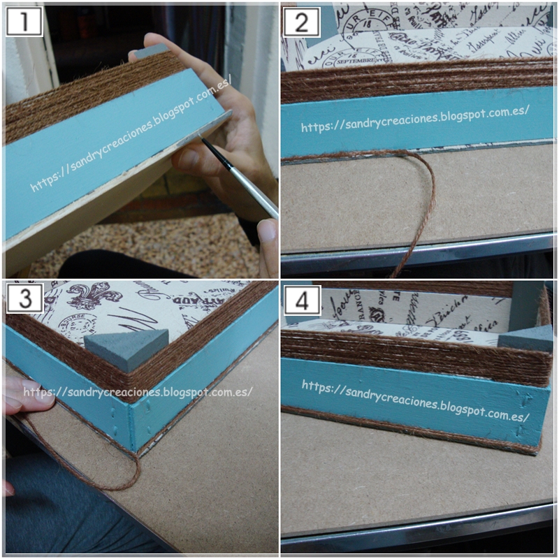 Para decorar la parte inferior primero pintamos con chalk paint de color vintage los bordes de la base (imagen 1) que no quedaron cubiertos cuando forramos la base con tela autoadhesiva. Una vez seca la pintura decoramos esta parte inferior con solo dos vueltas de cordón de yute pegándolas con cola blanca.