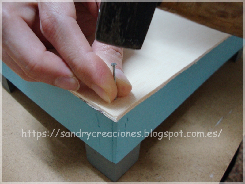 Paso 6. Pegar la base a la caja. Una vez decorada la base, recuperamos la estructura de la caja y pegamos la base a ella con cola blanca y 4 clavos, uno en cada esquina, para que quede mejor sujeta.