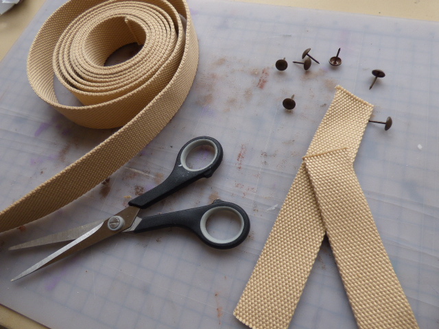 He conseguido esta cinta ancha y tachuelas de color bronce viejo. Estas últimas llevaba tiempo buscándolas, al final en una ferreteria viejecita de mi ciudad, he podido dar con ellas. Esos negocios casi de antaño, con ese olor particular, todo perfectamente organizado en mil cajoncitos....se te vá la vista en altas estanterias llenitas por completo de mil y una cosas y siempre trás el mostrador ese viejecito que sabe perfectamente qué es lo que le estas pidiendo y lo mejor......sabe exactamente en qué lugar de su tienda se encuentra jaja