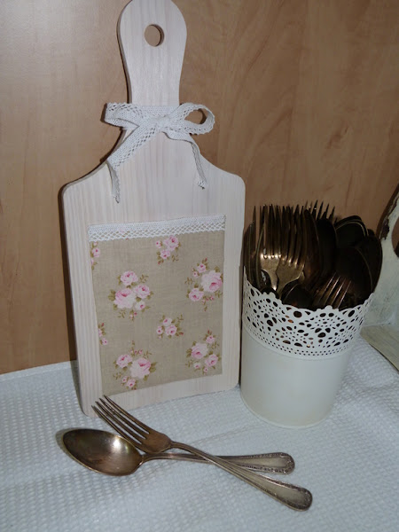 Tabla de cocina con bolsillo de tela y detalles de puntilla