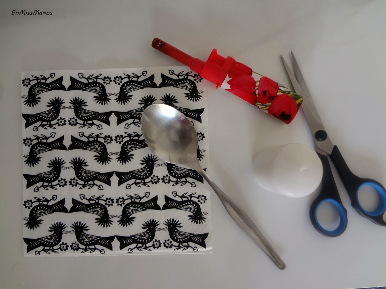 Para hacerlo hay que recortar el trozo de servilleta que quieras, quitarle las 2 capas sobrantes, calentar unos segundos la cuchara por la parte cóncava y por el otro lado de la cuchara ir dándole a la servilleta contra la vela. De esta manera la vela se va fundiendo y se va formando una capa fina de cera por encima de nuestra servilleta