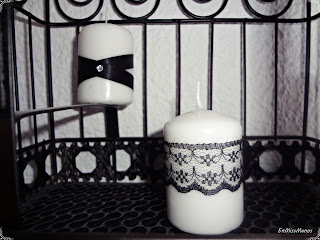Esta otra vela la forré con decoupage, con unas servilletas que sólo había usado para hacer el maniquí vintage. A parte de esa vez, nunca más había probado a hacer decoupage y esta vela la hice con un gel de decoupage que compré hace poco. Luego le puse una puntilla blanca y una cuerda con el detallito de una llave, como podéis ver.