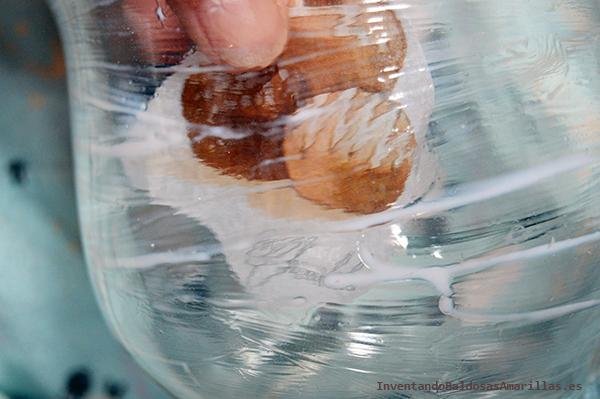 Podemos decorar nuestras botellas con servilletas. La idea es pegarlas por dentro para que así se vean completamente integradas en la pieza. Recortamos, quitamos todas las capas de las servilletas y luego pegamos. Ponemos gel con un pincel, colocamos el papel y volvemos a aplicar gel para ir retirando las posibles arrugas.