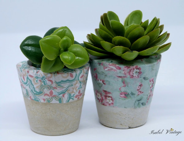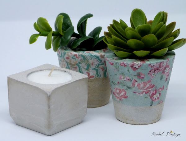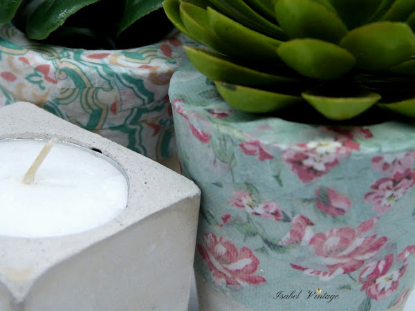 Macetas hechas con cemento y decoradas con decoupage, utilizando la técnica del papel de decopatch cortado y pegado a trocitos: