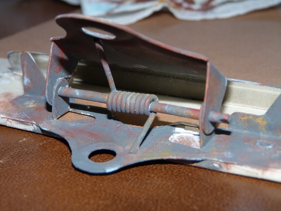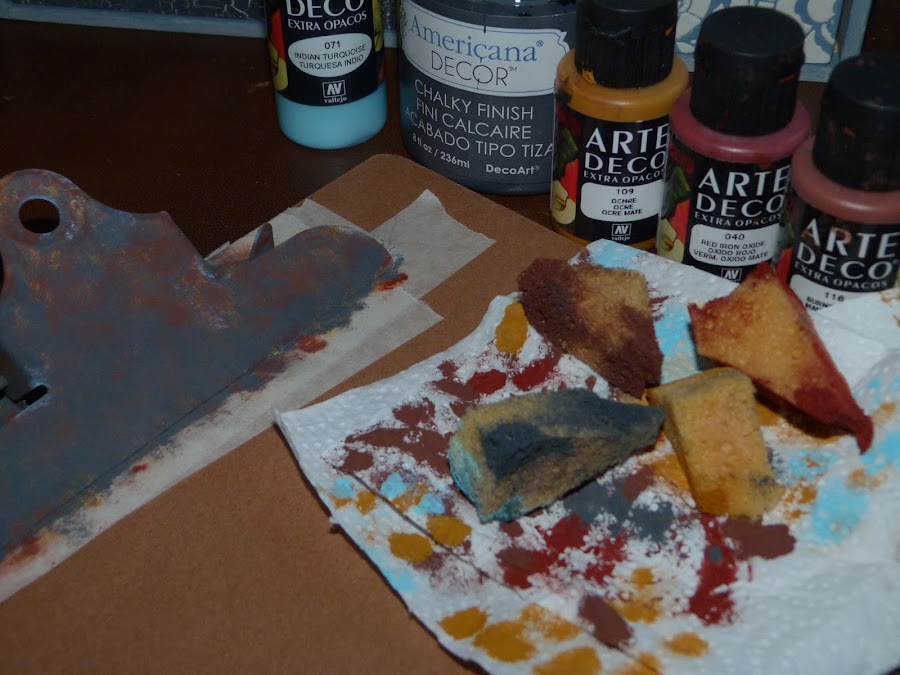 Después, he utilizado distintos tonos de pintura superpuestos aplicados con esponja, para hacerle un efecto envejecido: antracita, marrón siena, rojo óxido, ocre y turquesa.