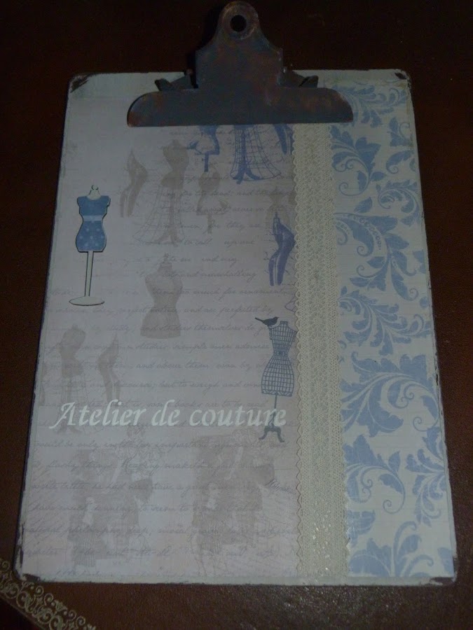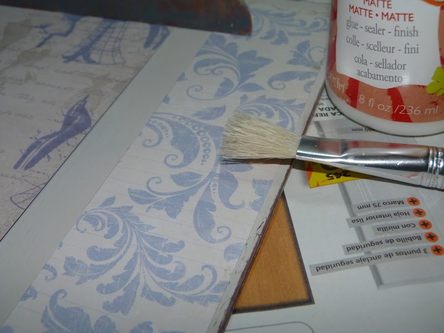 Gel de decoupage sobre la superficie, aplicar los recortes y nueva capa de gel sobre el papel.