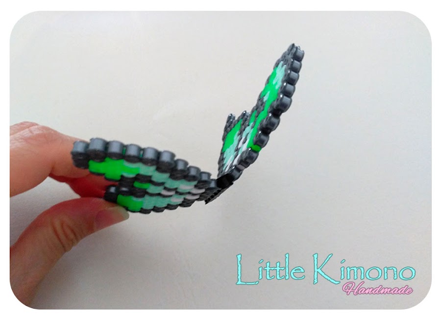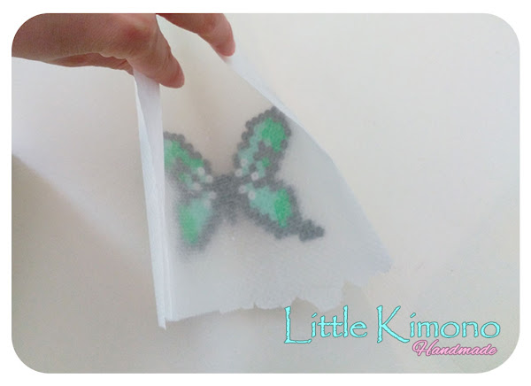 3. Aún caliente la pieza y asegurándonos que todas las hama están unidas, retiramos de la base "volcandola" sobre un trozo de papel para horno y colocamos sobre ella otro trozo de papel (es decir, la mariposa quedará entre dos trozos de papel de horno) le aplicamos un poco más de calor... y seguidamente doblaremos un poco los papeles sujetándolos de los extremos para que la mariposa tome una forma curvada ;)