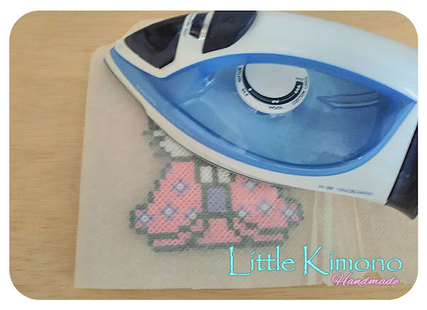 Cuando tengamos todas las mariposas que queramos llega la hora de aplicarles calor para que se queden unidas entre sí, colocando un trozo de papel para horno encima de las hama y con movimientos circulares aplicaremos calor con la plancha durante más o menos medio minuto, os dejo esta imagen de ejemplo...