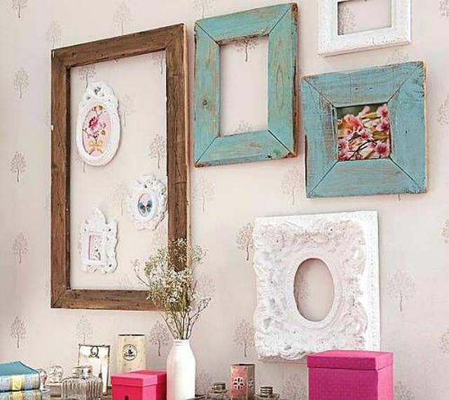 1. No puede faltar en ninguna composición de este tipo, marcos con efecto envejecido o decapado. Este efecto lleva muchas temporadas siendo estrella en la decoración y podemos conseguirlo de forma muy fácil con la famosísima pintura de pizarra o chalk-paint y un poco de papel de lija, no necesitas más cuanto mas imperfecto mejor será el resultado.