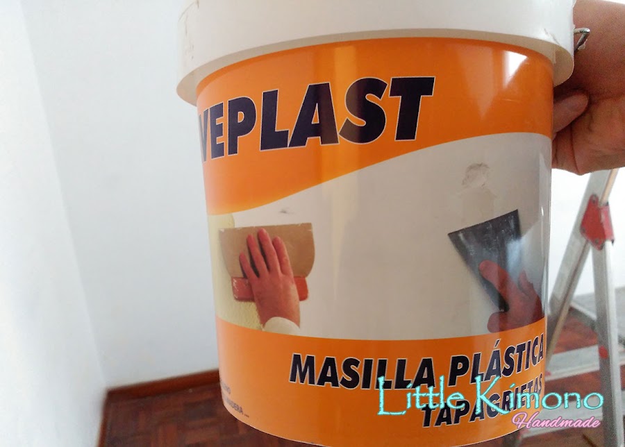 1. Nos ponemos manos a la obra! Primero tapamos todos los agujeros e imperfecciones con masilla. Una vez seca lijamos la superficie para igualarla.