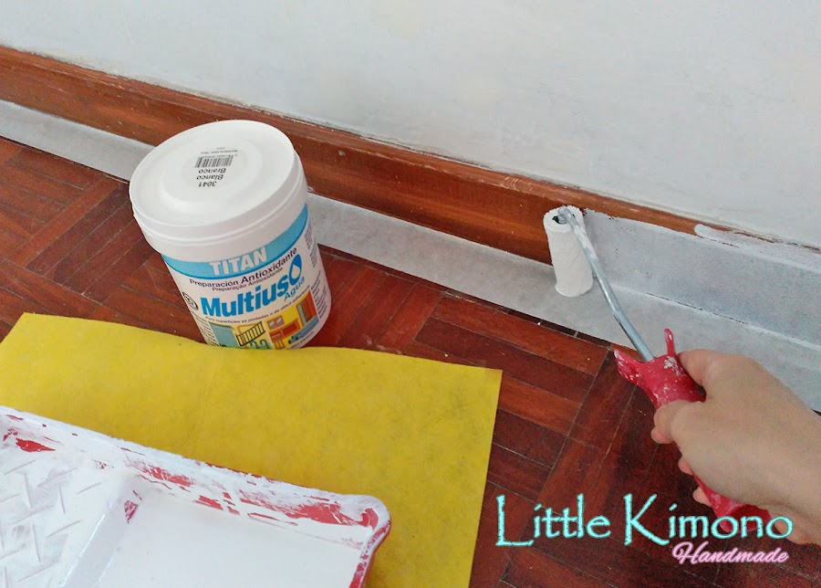 2. Pintamos rodapiés, marcos y puertas con esmalte blanco. Primero usaremos 1 o 2 manos de imprimación multiuso y luego 2 de esmalte al agua satinado.