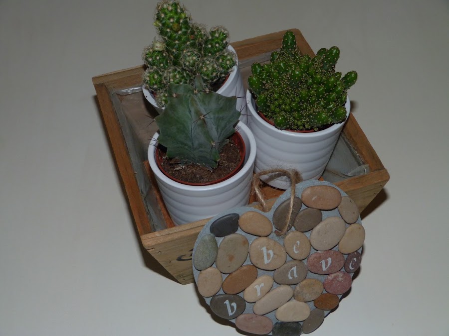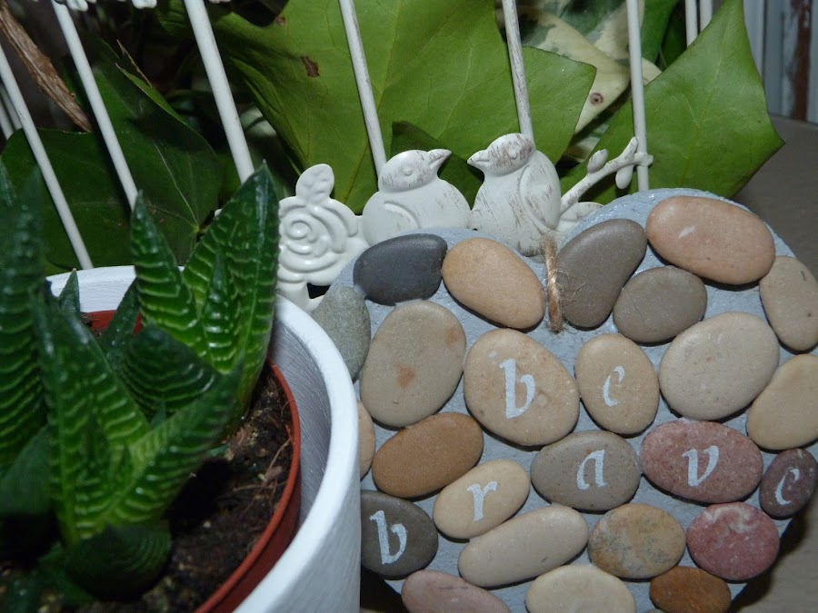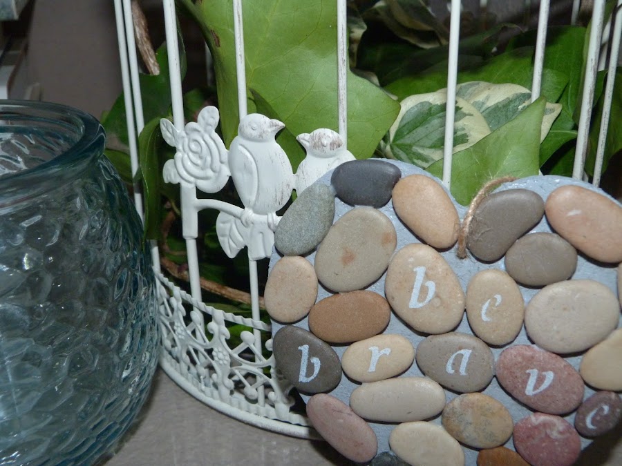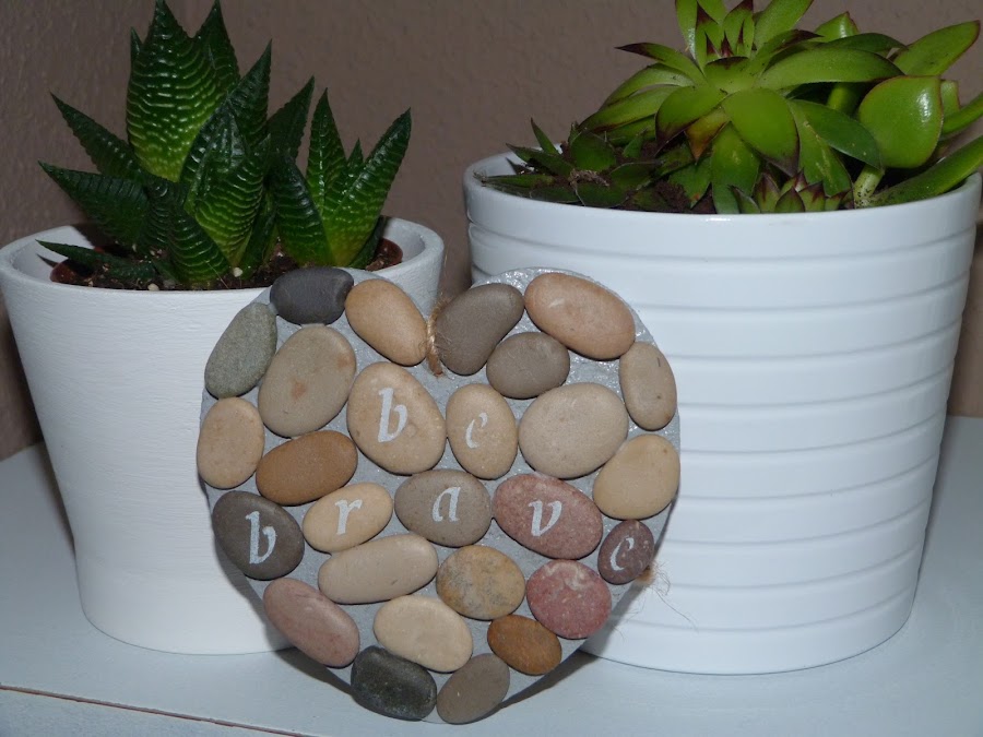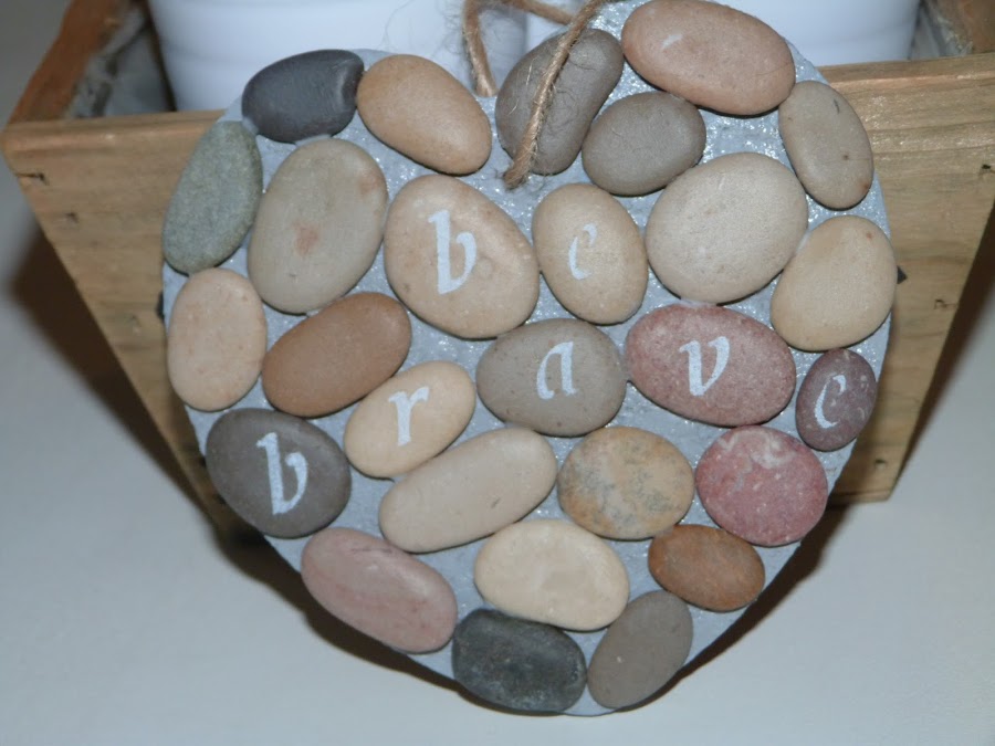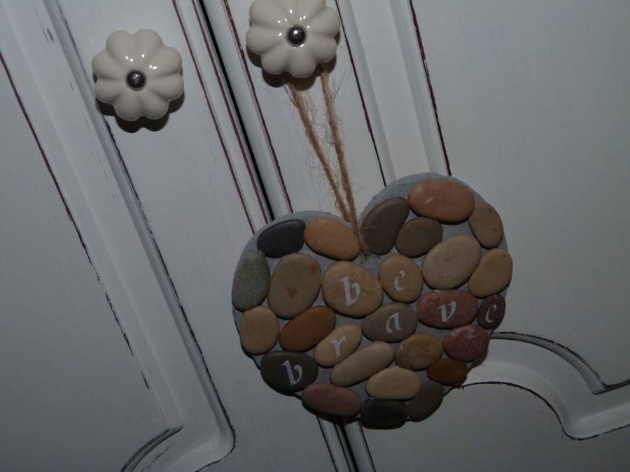 Después, he estarcido una frase en las piedras: "Be Brave", Sé Valiente. Por último, he pasado una cuerda por el agujerito que hice al principio para poder colgar el corazón.