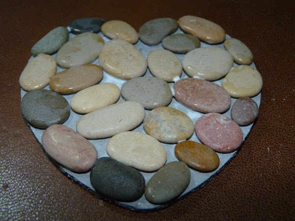 Antes de nada, he hecho un agujerito en la parte superior del corazón, y lo he pintado para cubrir los inevitables huecos entre piedras. Después, las he ido pegando con cola hasta cubrirlo por completo. En esta foto, la cola no ha terminado de secar... las prisas!