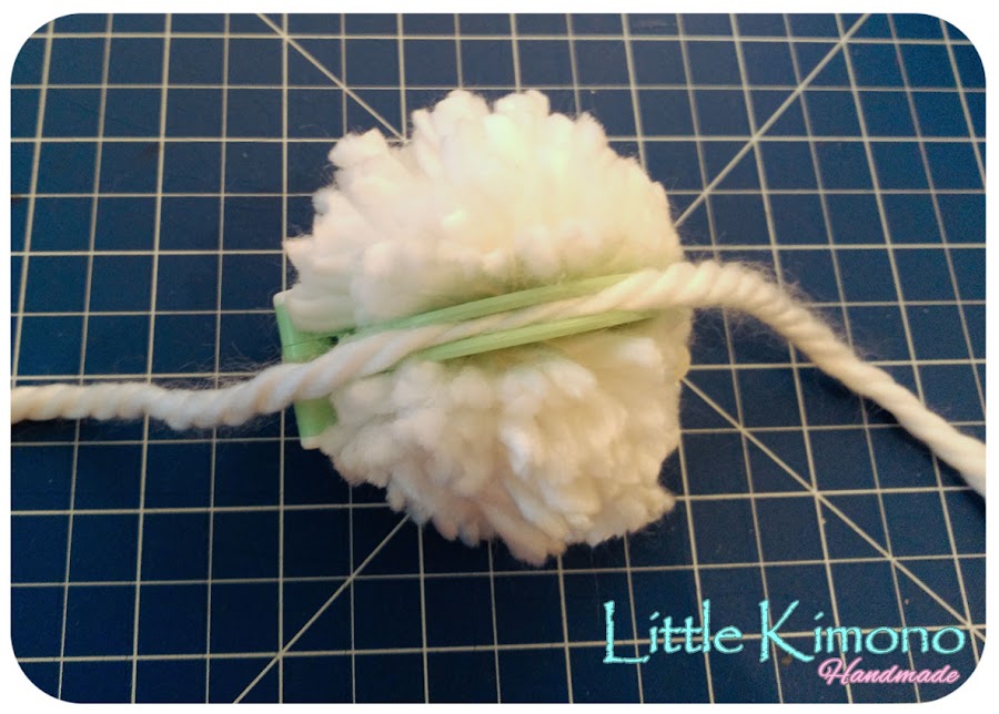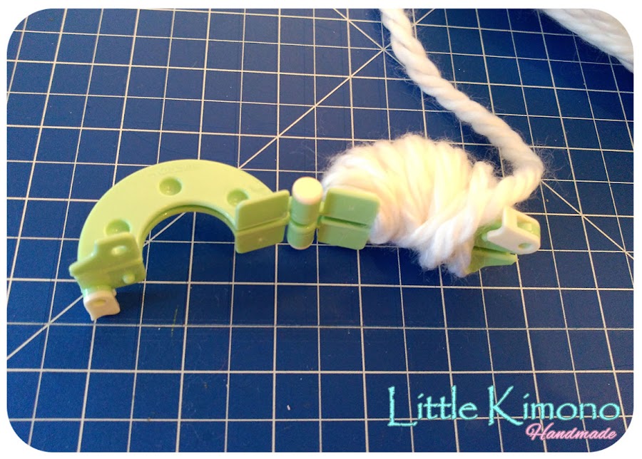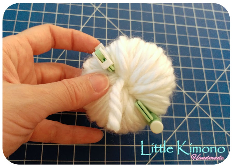 2. Cerramos con la pinza (en mi caso blanca) que está colocada en el extremo y cortamos la lana por en medio de las dos piezas.