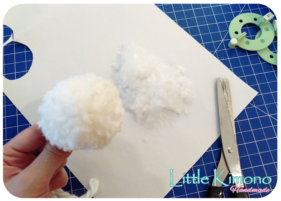 6. Las pegamos en el pompón, a continuación podemos hacer otro pompón más pequeñito o usar uno de bolsa para la cola.