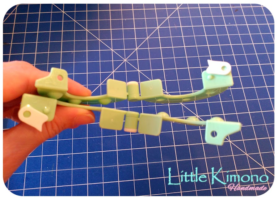 Yo he escogido el tamaño verde que es para un pompón medianito, abrimos las dos piezas y las "encajamos" (los puntos dentro de los agujeros)