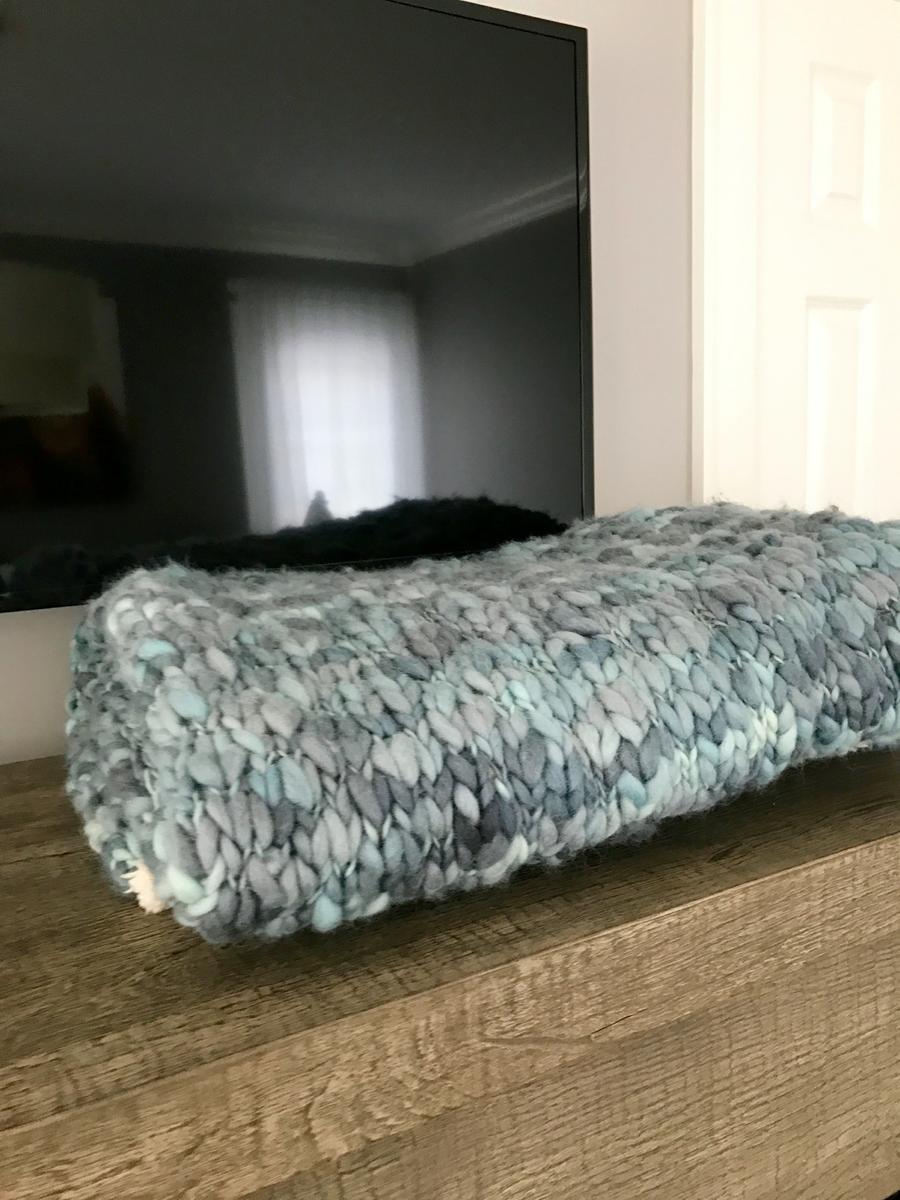 Las mantas de lana fueron apoyadas prolijamente en los sillones del living, al lado del fuego de la chimenea, y para completar el efecto visual se tejieron almohadones con lana gorda, despareja, en punto jersey, con aguja gorda, haciendo un efecto de ola en la trama. Los almohadones de dos sillones tenían solamente una tapa tejida, mientras que la otra era de tela en liberty.