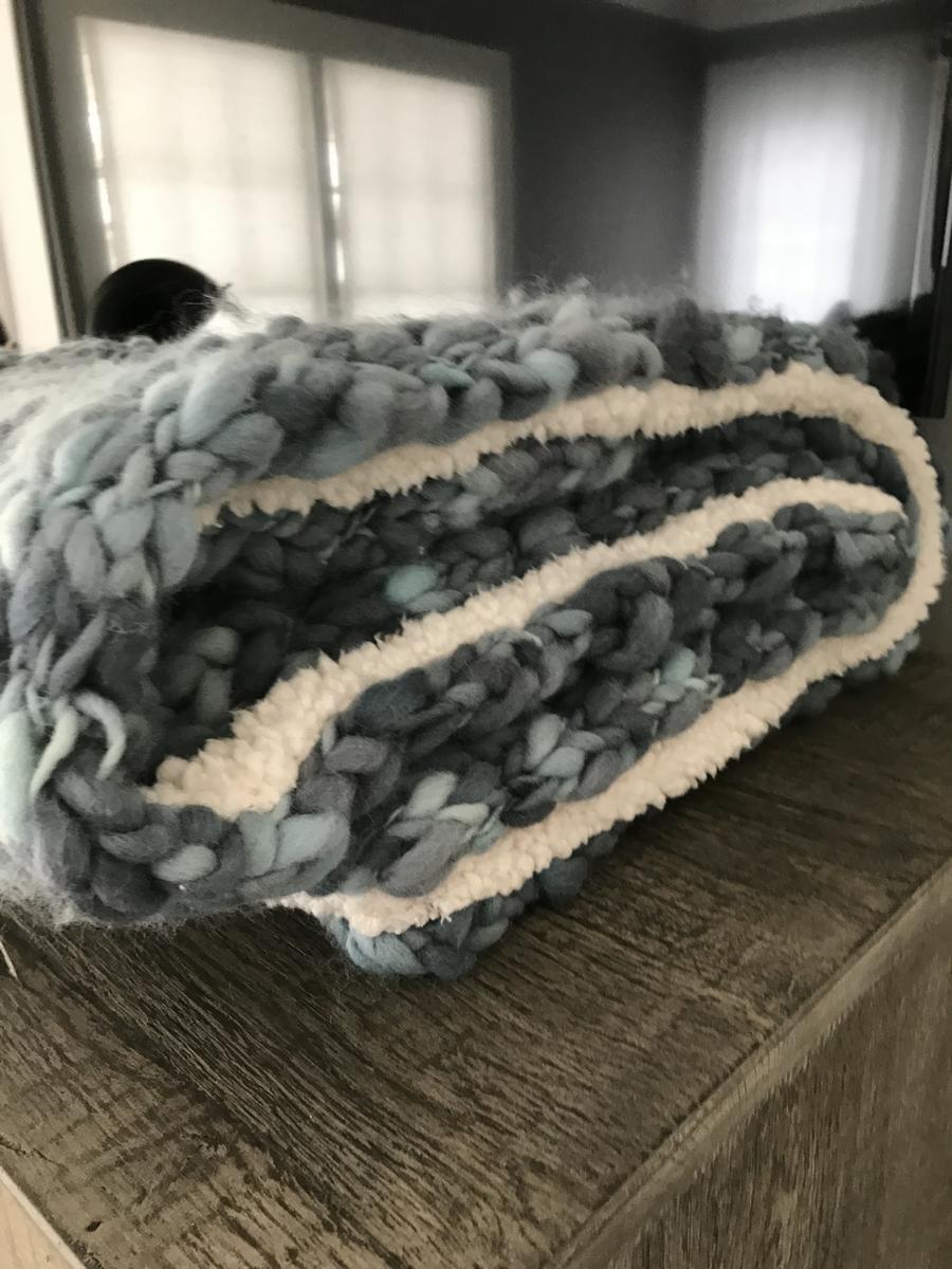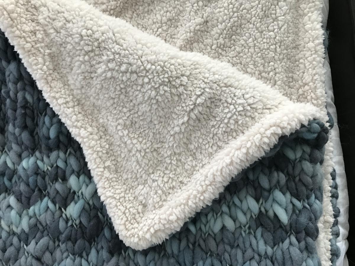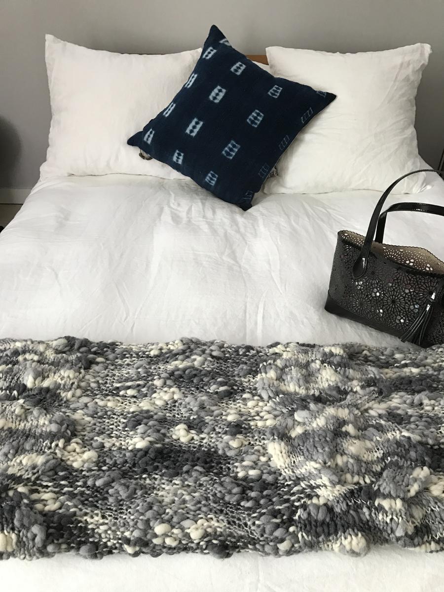 En el cuarto principal, a los pies de la cama, se colocó una manta tejida en colores azul, en punto jersey, con aguja muy gorda, y se la forró con una tela de cordero, sintética. Sirve tanto para abrigar como para que la perra de la casa se suba a la cama -con permiso- y duerma allí.