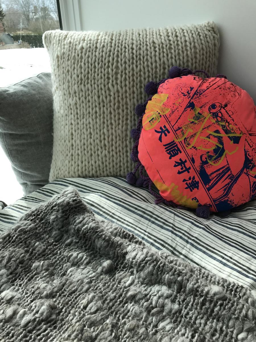 En la ventana de la casa de huéspedes, que da al jardín trasero de la casa principal, se ubicaron almohadones de tela de loneta en colores neutros, dos almohadones en lana pura, tejidos en puntos jersey, y una manta de lana color gris, con los bordes tejidos en punto Santa Clara (todos las vueltas al derecho) y en el centro en punto jersey (una vuelta todos los puntos al derecho, y la siguiente todos los puntos al revés). Para darle un golpe de color se mezclaron dos almohadones en tonos flúo y borlas en azul brillante.