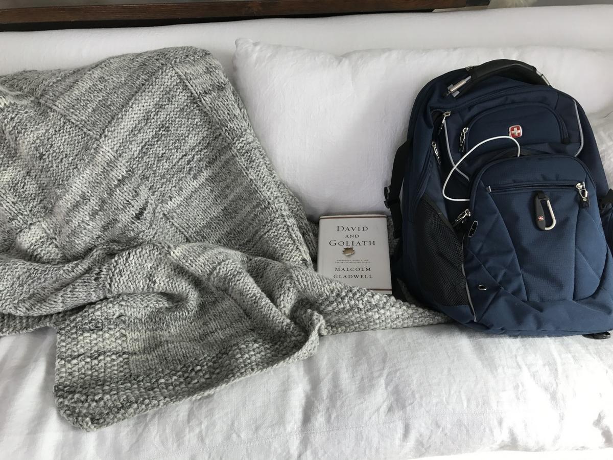 En el cuarto del varón, que ya terminó la universidad y que en cualquier momento tiene su propio lugar, y la habitación pasa a ser de huéspedes, la dueña de casa tejió una manta en tonos de blanco, gris y celeste. Se usaron punto jersey puesto del revés y trenzas encontradas de grandes dimensiones. La manta está puesta a los pies de la cama, con medidas generosas, está preparada para servir de accesorio para cuando empiezan las primeras nevadas, o cuando el verano obliga a colocar el aire acondicionado.