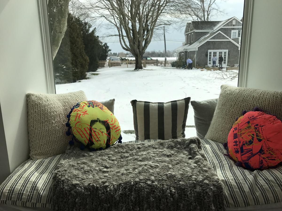 Los almohadones de la casa, están por todos lados; hasta en los bow windows que miran a la vivienda del vecino, que en verano planta y cosecha flores, pero en invierno está todo nevado.