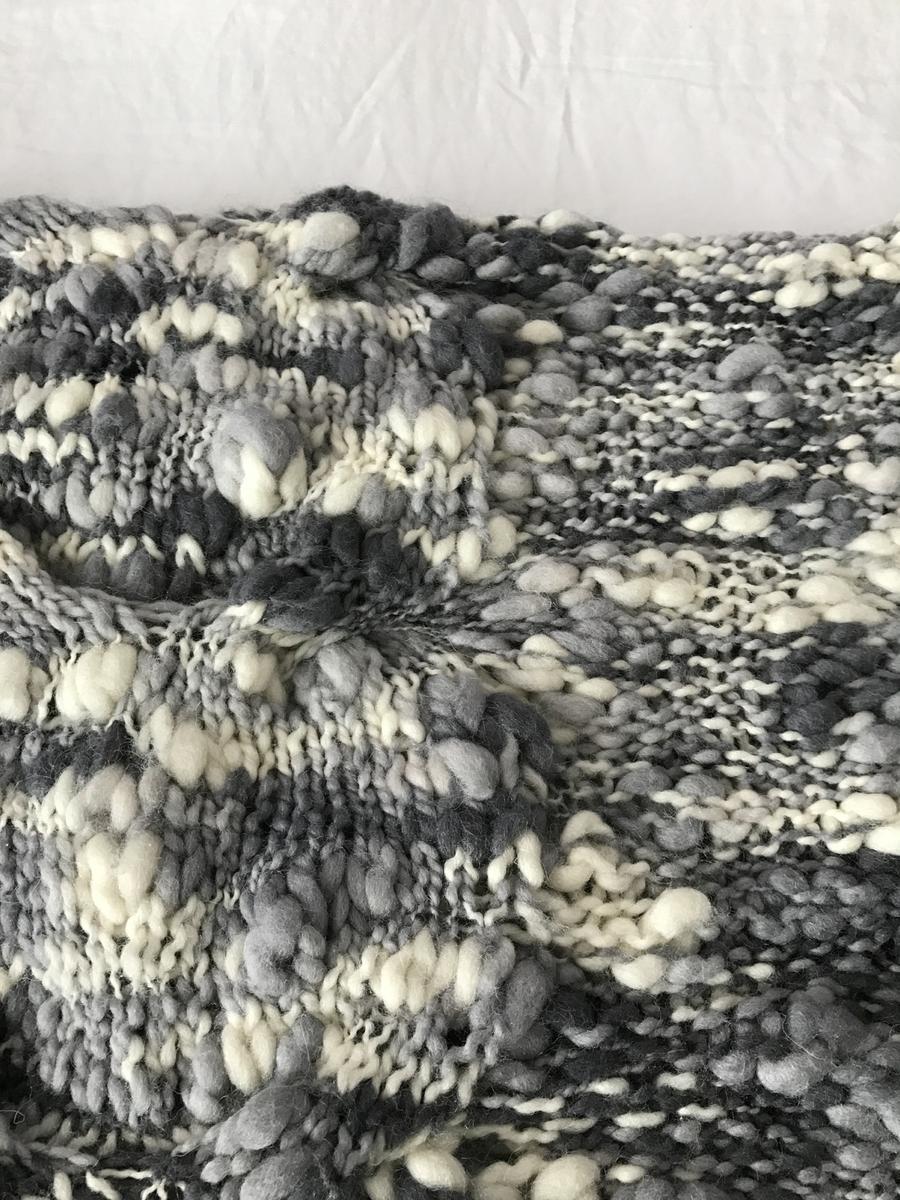 Sobre uno de los sillones de color blanco, se colocó una manta en color gris, con los bordes tejidos en punto arroz, y en el centro rectángulos en punto jersey.