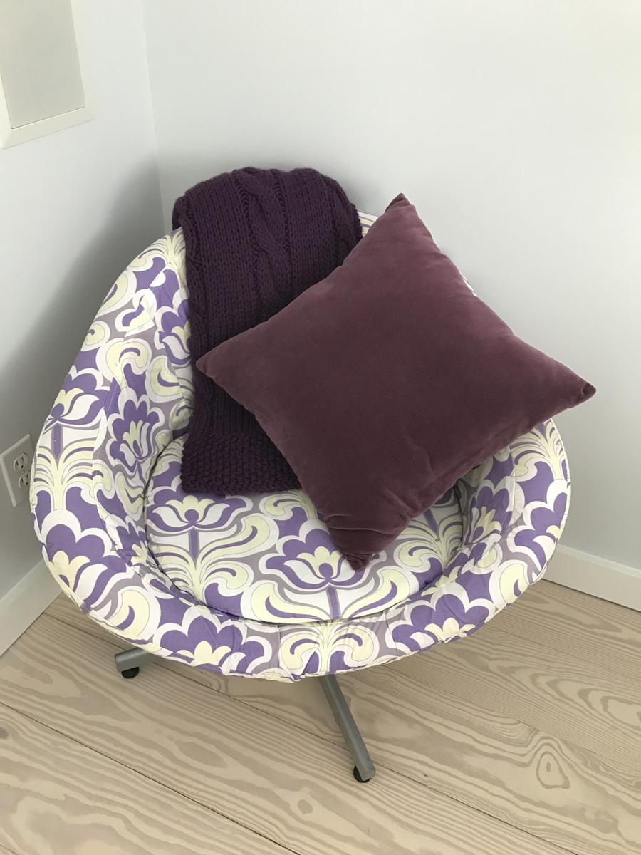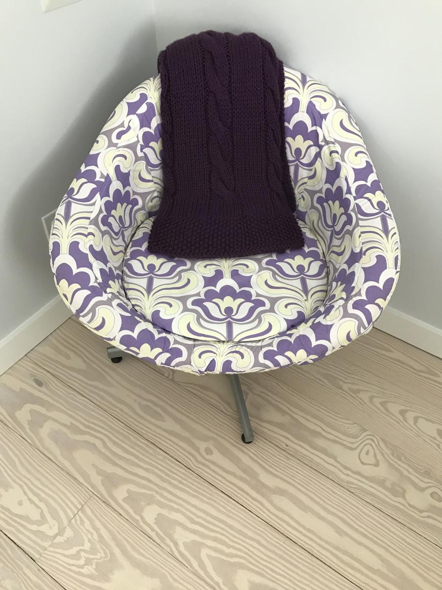En el cuarto de la hija, acompañando el estampado del tapizado de un pequeño sillón, se tejió una manta de color violeta en punto jersey con pequeñas trenzas. Como complemento a la decoración se colocó un almohadón de pana de un color similar.